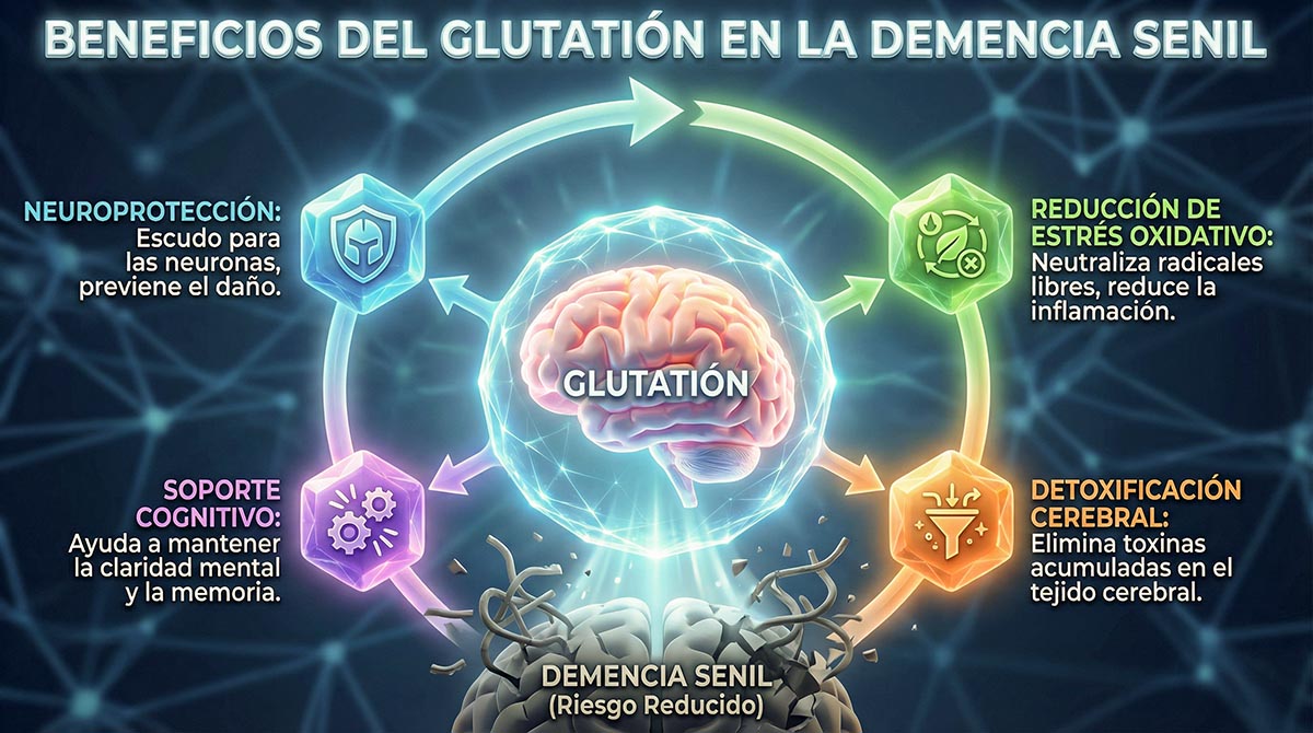 Los estudios son claros: pacientes con demencia tienen 30-50% menos glutatión cerebral que adultos mayores cognitivamente sanos.