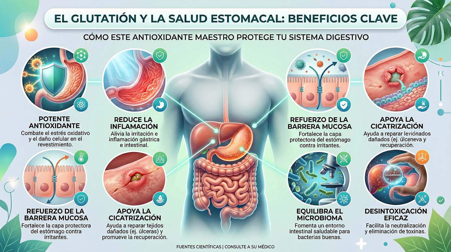 Tu estómago secreta una capa de moco que impide que el ácido toque directamente la mucosa. El glutatión mantiene ese moco funcional y resistente.