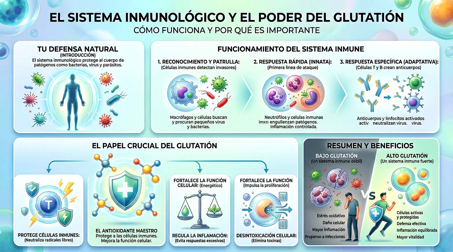 Es esto: Tus linfocitos, macrófagos y células natural killer (las células que defienden tu cuerpo) necesitan glutatión como combustible para multiplicarse, activarse y atacar patógenos. Sin él, son como soldados sin municiones.